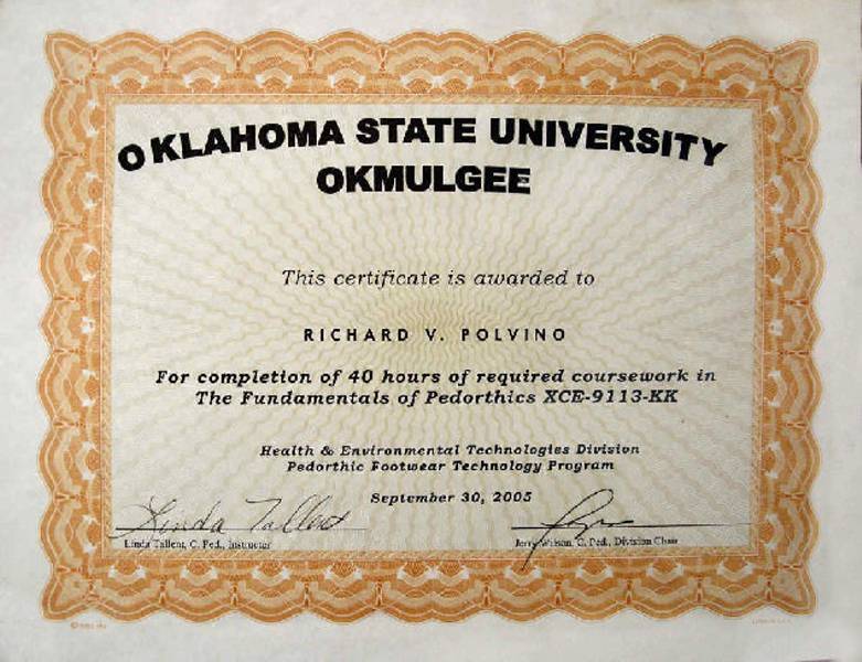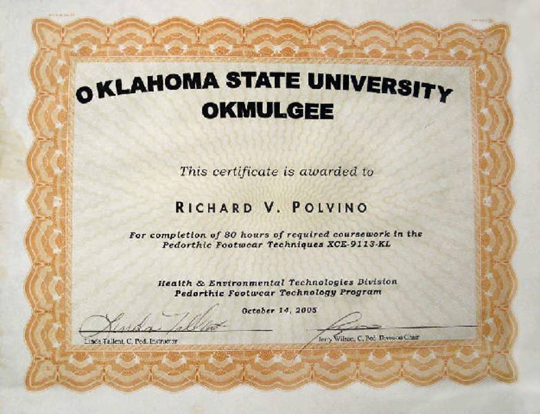 See Pedorthic Footwear Technology Certificates from Oklahoma State University below.